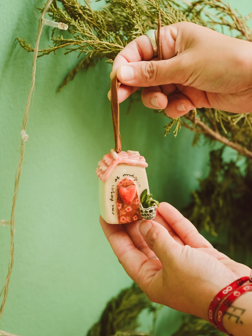 Adornito en forma de casa, con maceta en la puerta, y la frase "mi hogar es magia". Tiene un cordon gamuzado para colgar.