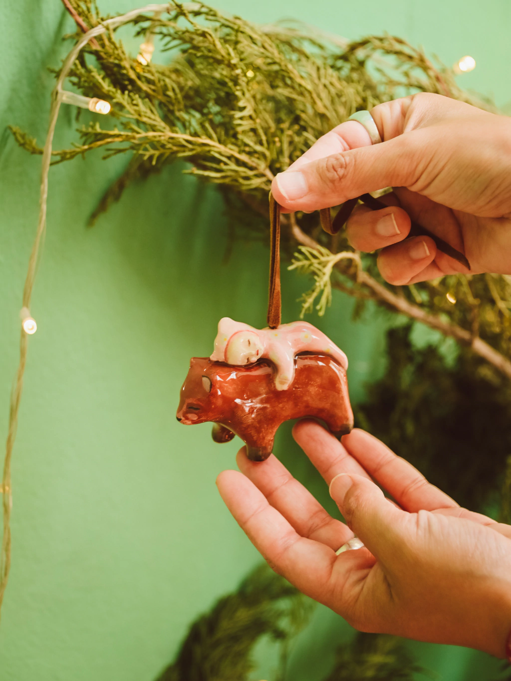 Adornito en forma de oso con niña dormida. Tiene un cordon gamuzado para colgar.