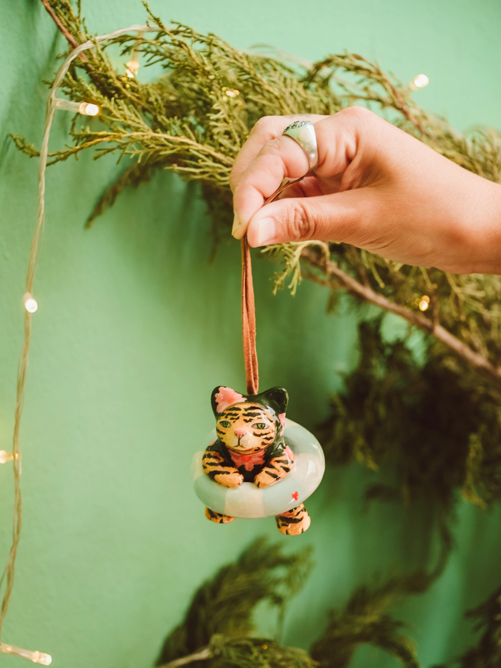 Adornito en forma de tigrecito, con traje de baño floreado y flotador. Tiene un cordon gamuzado para colgar.