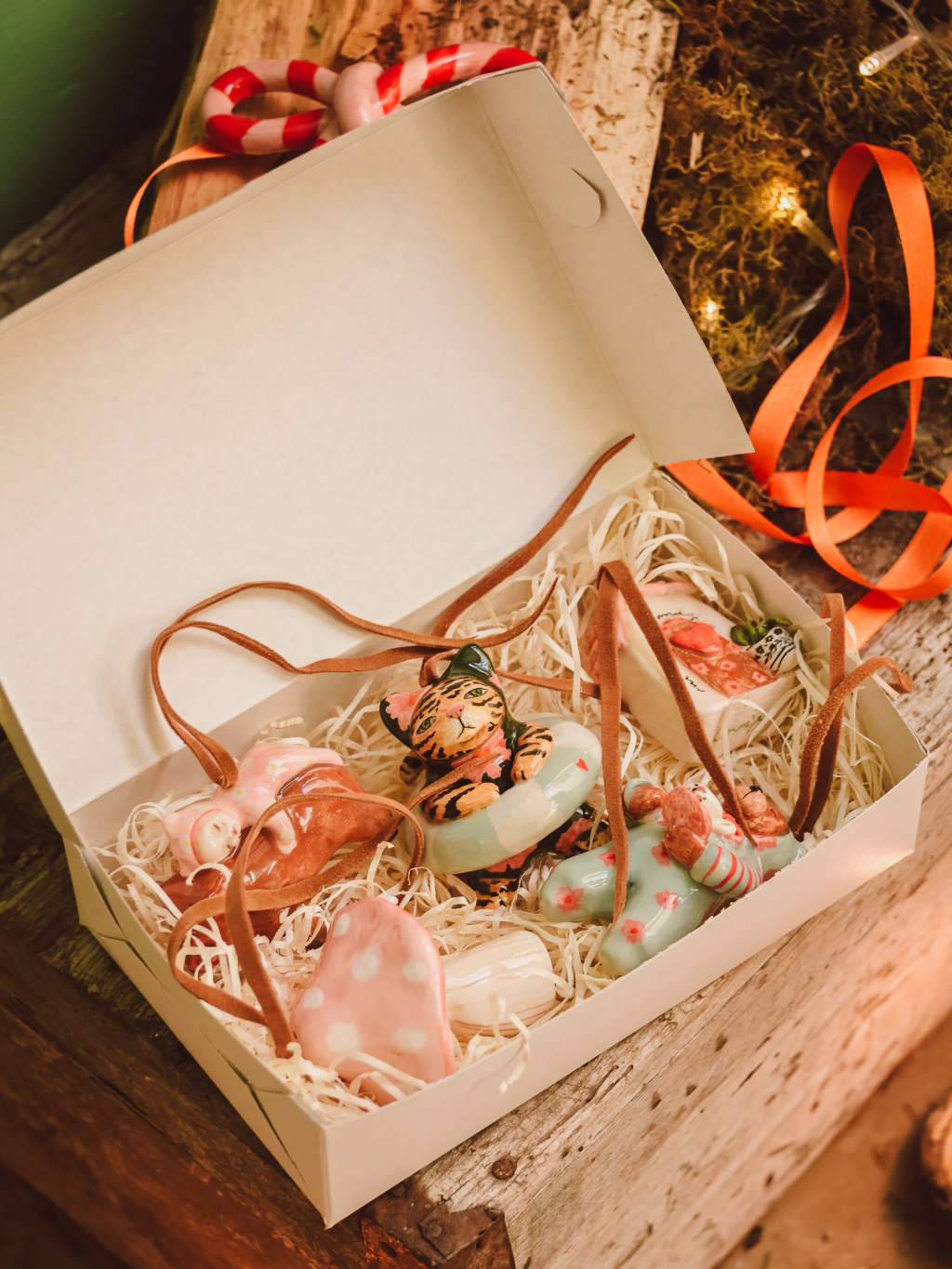 Caja con 5 adornitos realizados uno a uno, totalmente a mano. Esmaltados al detalle. Cada uno tiene un ojalcito pequeño de alambre en la parte superior y traen pasado un cordon gamuzado color marron, se puede sacar y cambiar. Los diseños que incluye son: un osito-reno, un hongo, una casita, un tigre con flotador y una niña durmiendo en osito.