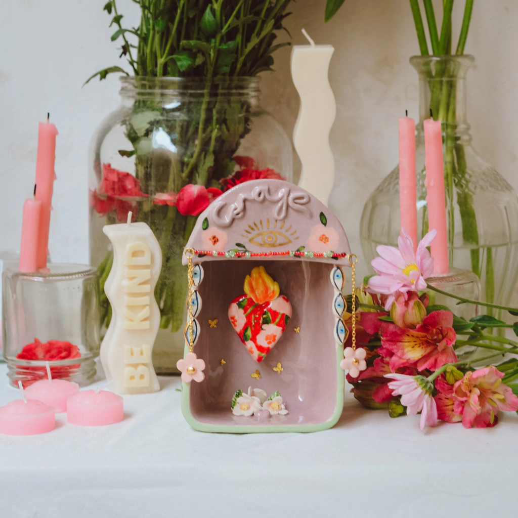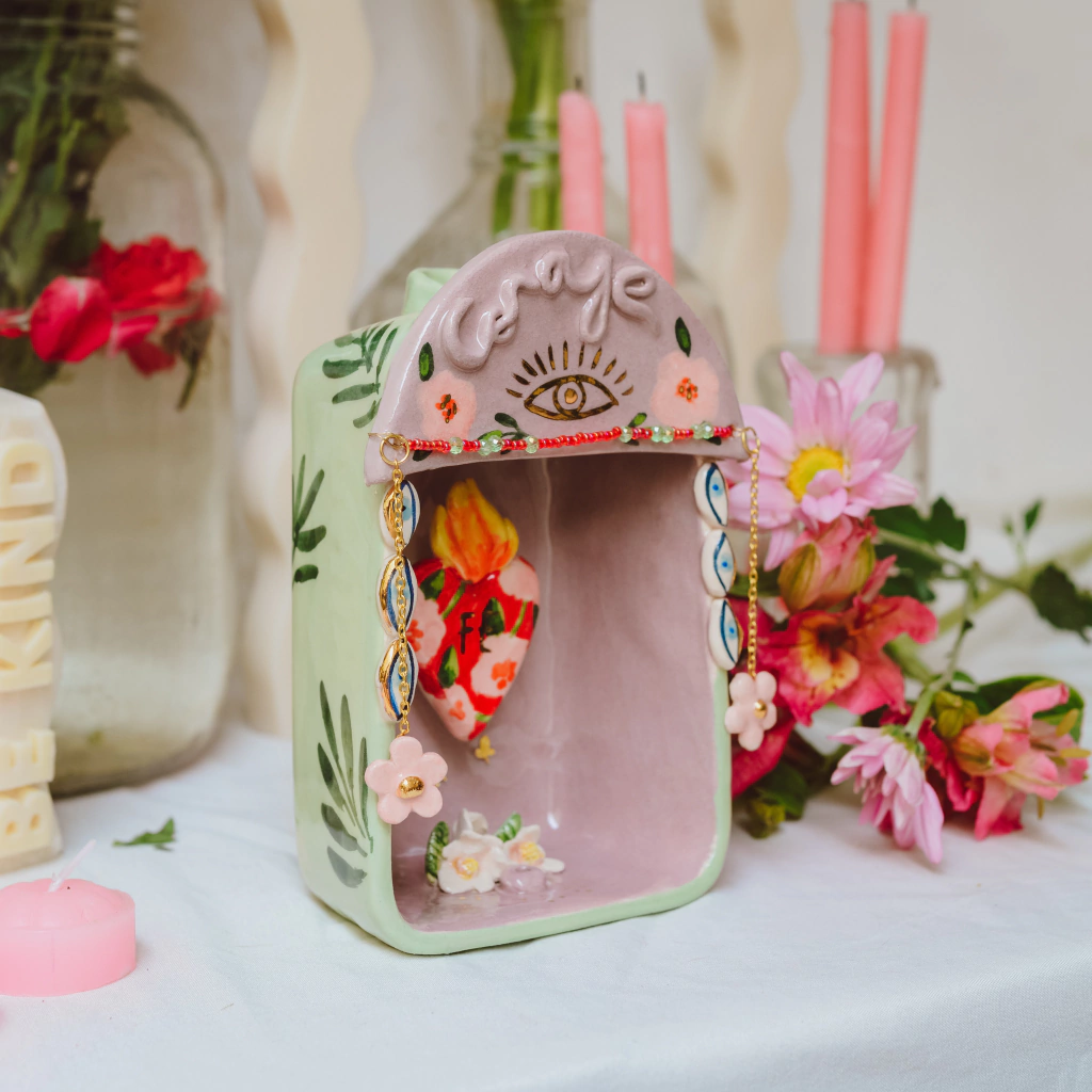 La pieza esta realizada en su totalidad a mano cuidando hasta el mas minimo detalle. Tiene destellos en oro liquido, son pequeñas obritas con detalles con cristales de roca y mostacillas de vidrio.