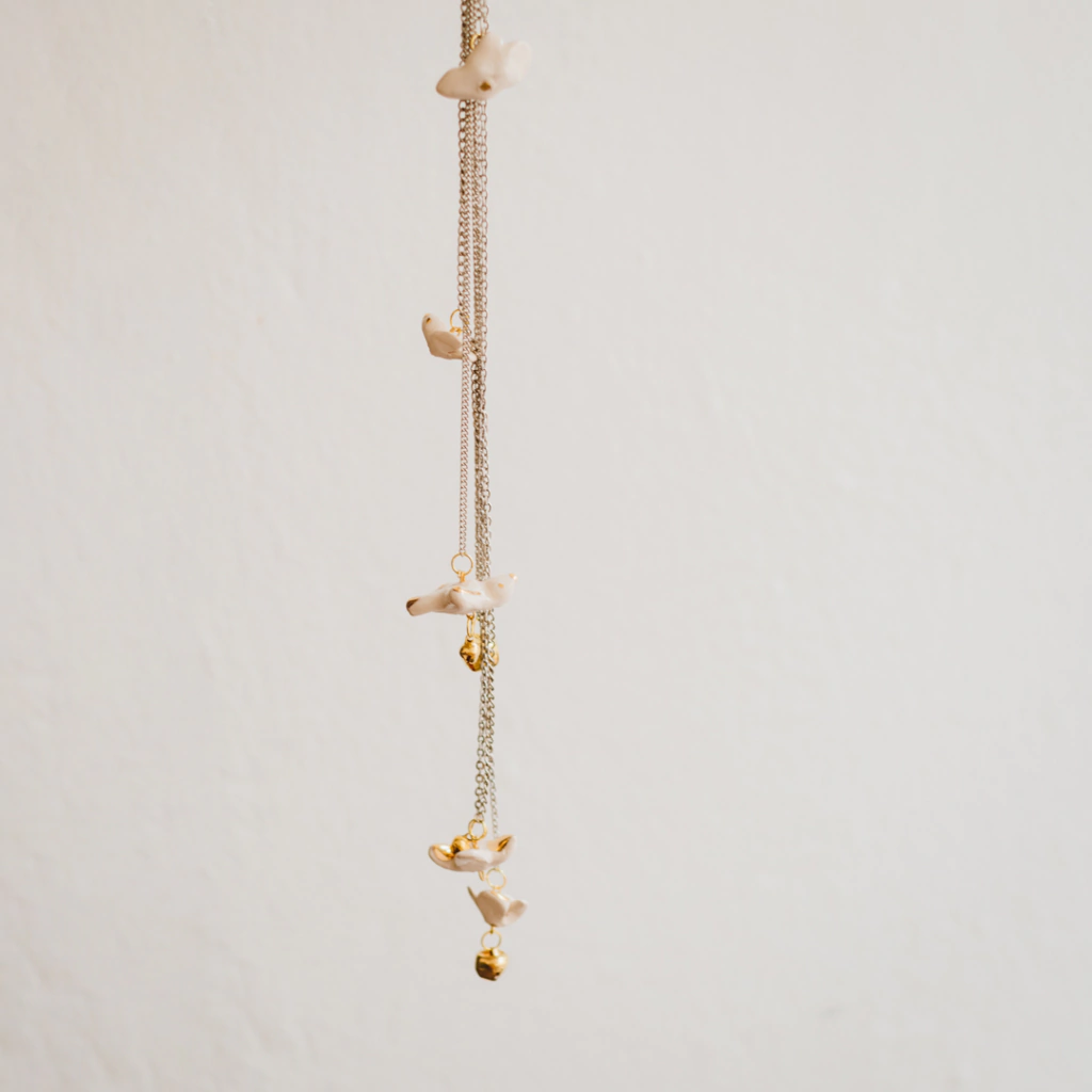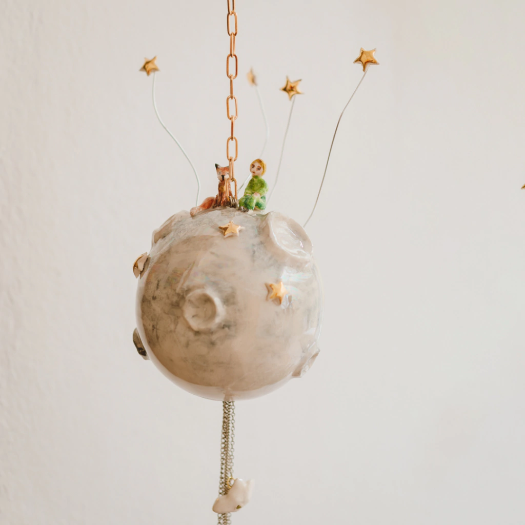 Colgante de la cápsula "mi secreto" inspirada en el maravilloso mundo del pequeño principito. Se trata de un colgante decorativo lleno de magia, es el principito y el zorro en el asteroide B-612, por debajo cuelga con finas cadenitas, una bandada de pajaros silvestres con cascabelitos como los que ayudan a salir de su planeta al principito, Toda la pieza es original de Coraje, es única y tiene detalles de tornasolados y oro liquido. Sin dudas desparrama magia al moverse en cualquier espacio en el que este colgada.