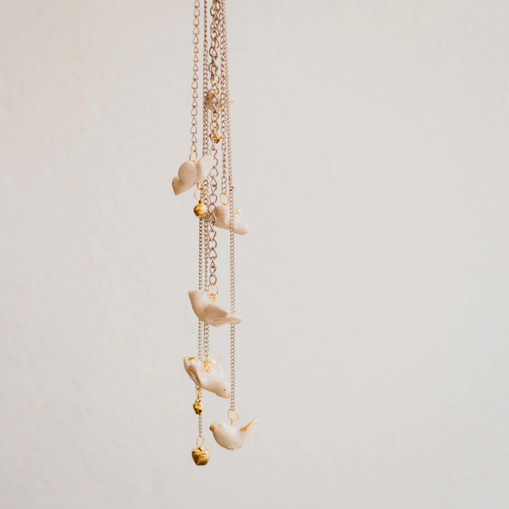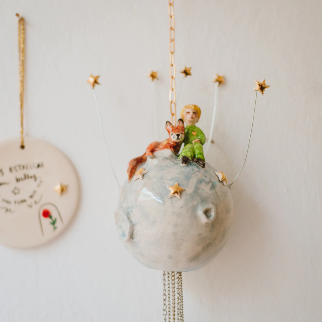 Colgante de la cápsula "mi secreto" inspirada en el maravilloso mundo del pequeño principito. Se trata de un colgante decorativo lleno de magia, es el principito y el zorro en el asteroide B-612, por debajo cuelga con finas cadenitas, una bandada de pajaros silvestres con cascabelitos como los que ayudan a salir de su planeta al principito, Toda la pieza es original de Coraje, es única y tiene detalles de tornasolados y oro liquido. Sin dudas desparrama magia al moverse en cualquier espacio en el que este colgada.