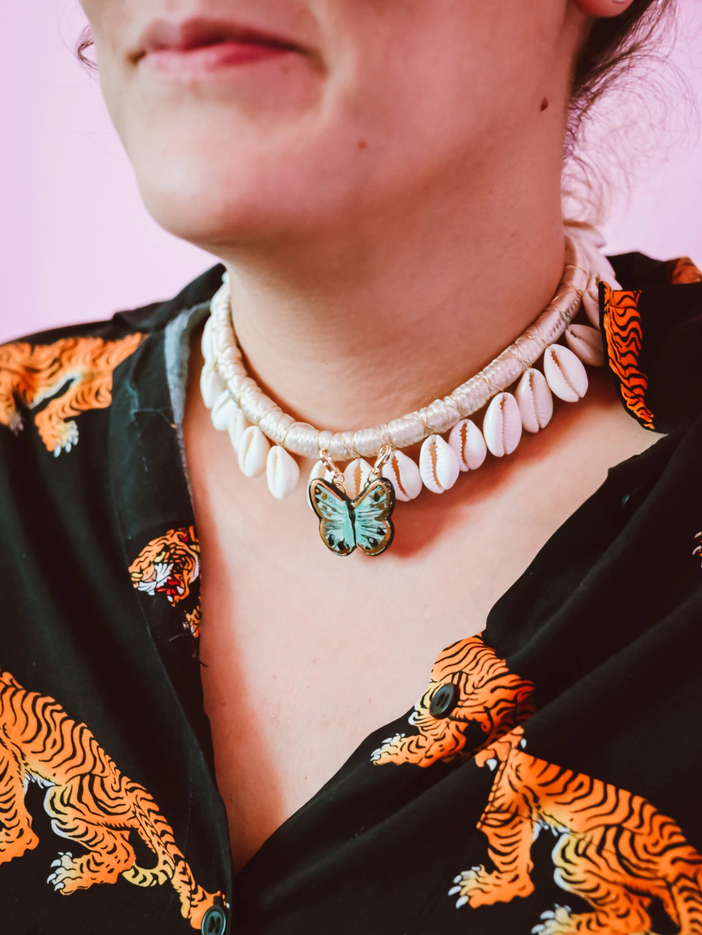 Esta pieza es super especial. Esta realizada con un cordon gureso forrado, color beige. Tiene toda una vuelta de caracoles buzios enlazados con alambre de acero. Lo que hace único a este collar es que la mariposita del frente es totalmente desmontable. tiene dos prendeduras y podes sacarla cuando quieras y volver a engancharla en el alambrecito.