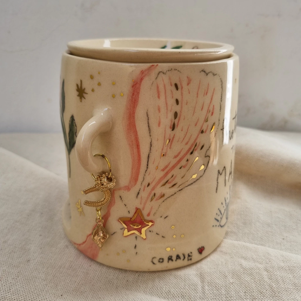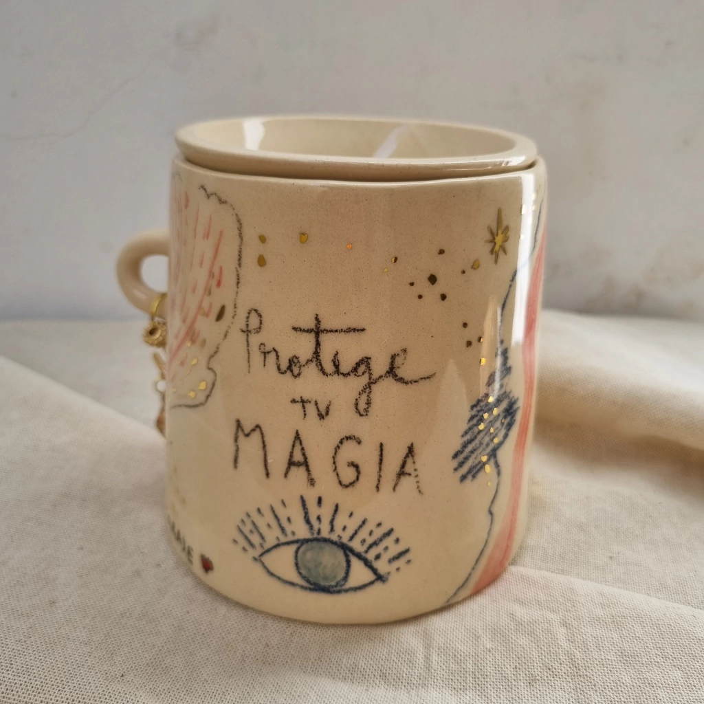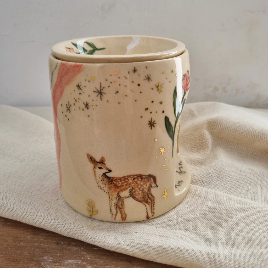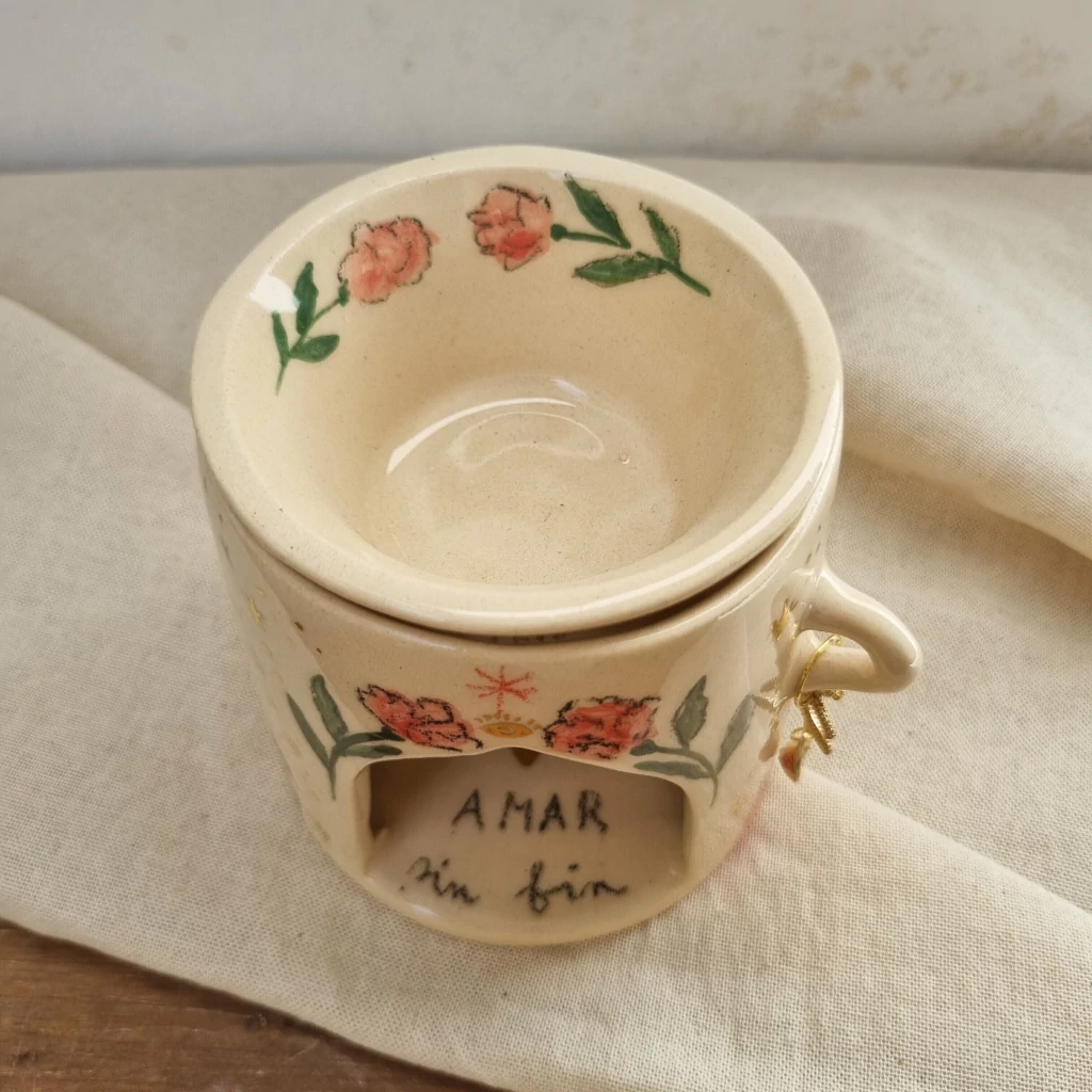 Hornillo para escencias. Funciona con una velita en la entrada frontal y escencia solida o en aceite en la parte de arriba. Esta ilustrado con crayones ceramicos, pigmentos y tiene detalles en oro liquido. La parte superior del hornillo se puede sacar para limpiarlo comodomente.