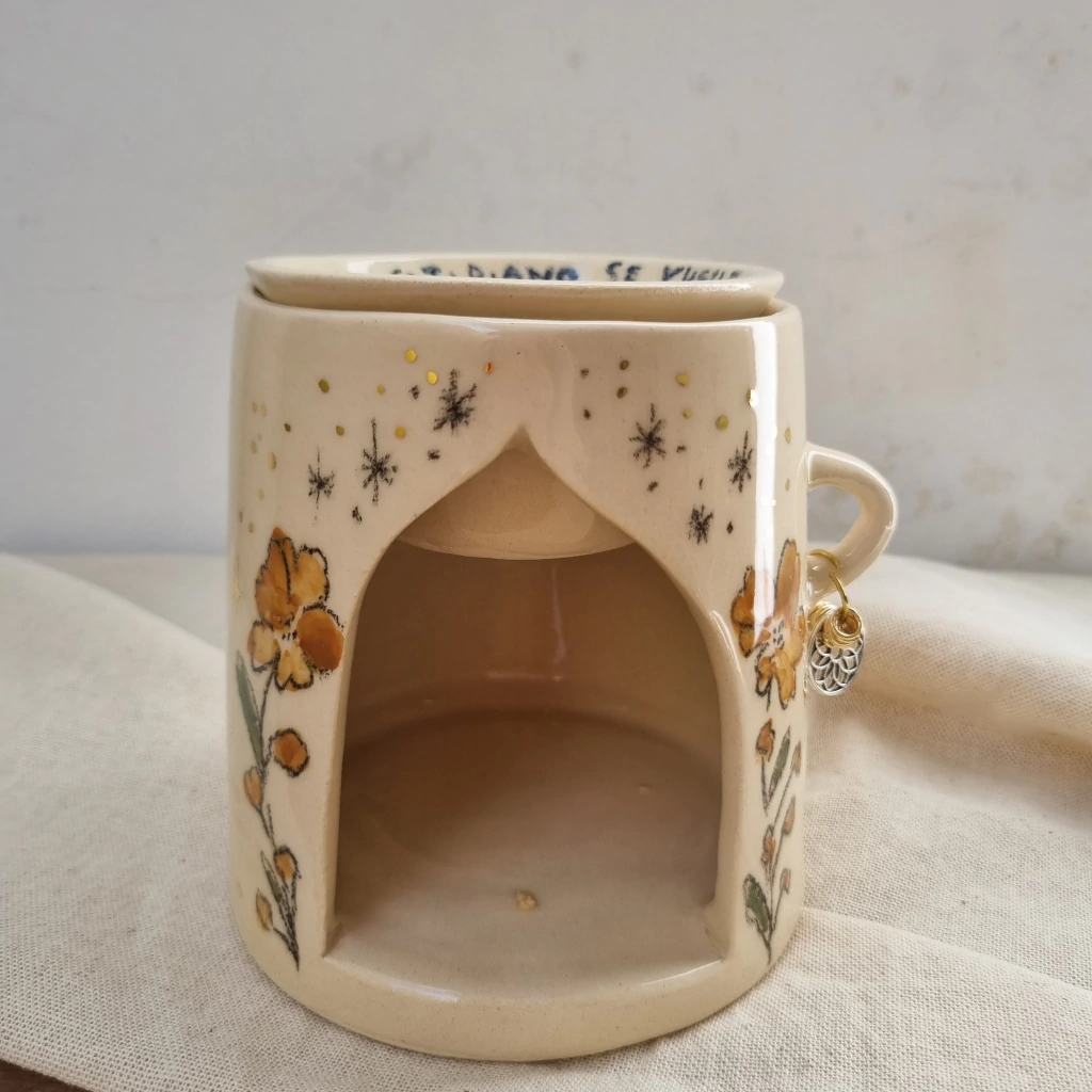 Hornillo para escencias. Funciona con una velita en la entrada frontal y escencia solida o en aceite en la parte de arriba. Esta ilustrado con crayones ceramicos, pigmentos y tiene detalles en oro liquido. La parte superior del hornillo se puede sacar para limpiarlo comodomente.