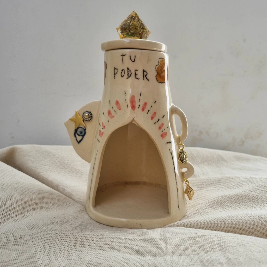 Hornillo para escencias. Funciona con una velita en la entrada frontal y escencia solida o en aceite en la parte de arriba. SE USA DESTAPADO y se tapa a modo de decoracion. Esta ilustrado con crayones ceramicos, pigmentos y tiene detalles en oro liquido pero la verdadera estrella de este hornillo es su diamante, realizado encapsulando flores naturales secas, en resina epoxica.