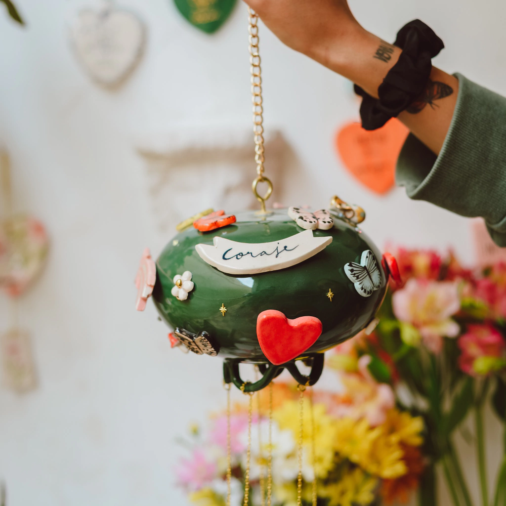 Estas piezas hermosas estan pensadas para armonizar y hacer mágico cualquier espacio de tu casa donde una suave brisa los haga mover y sonar suavemente. Se trata de una esfera gigante de ceramica llena de amuletitos y brillos. en la parte inferior cuelgan con cadenas cañitos de aluminio y un dije mas de ceramica que los hace sonar. Yo creo en la magia y vos?