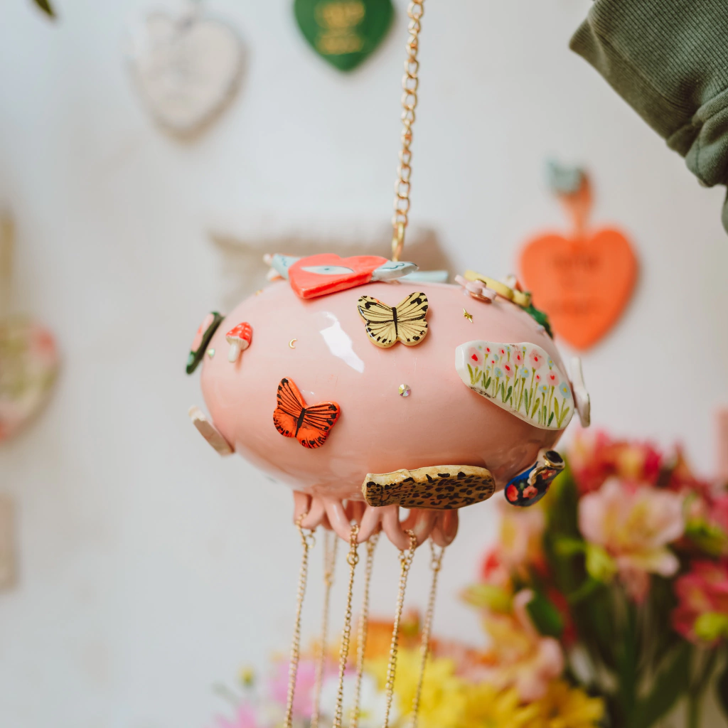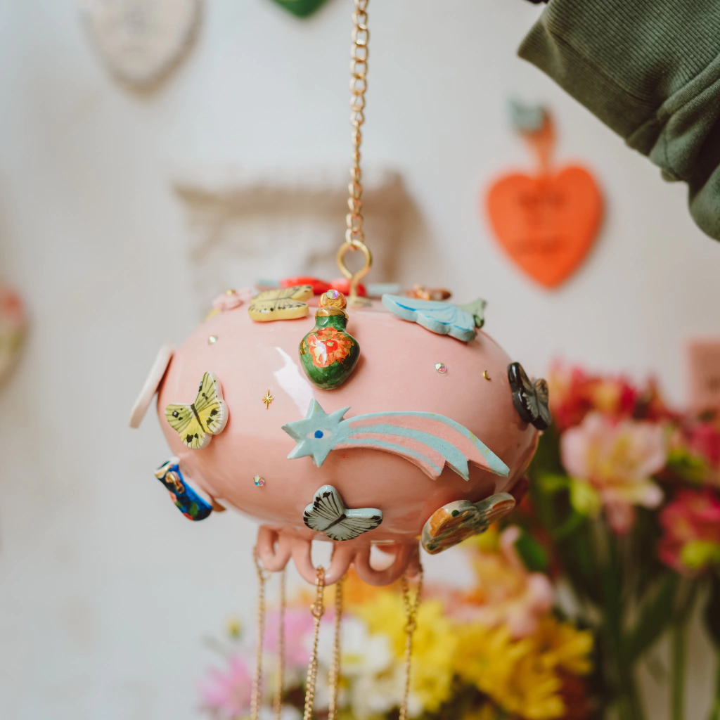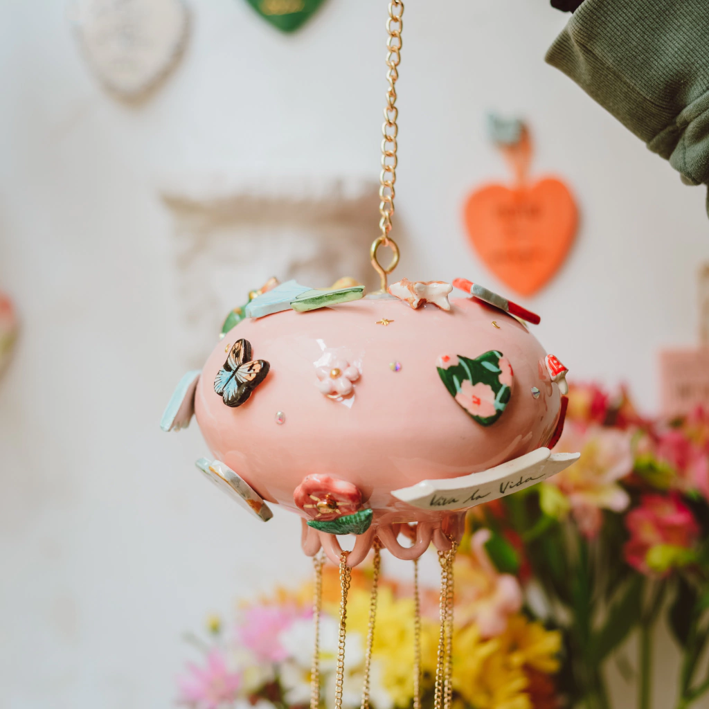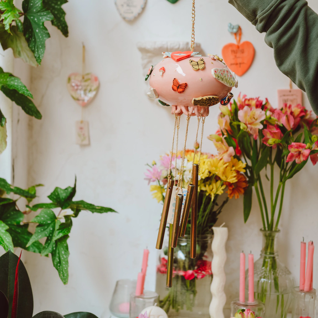 Estas piezas hermosas estan pensadas para armonizar y hacer mágico cualquier espacio de tu casa donde una suave brisa los haga mover y sonar suavemente. Se trata de una esfera gigante de ceramica llena de amuletitos y brillos. en la parte inferior cuelgan con cadenas cañitos de aluminio y un dije mas de ceramica que los hace sonar. Yo creo en la magia y vos?
