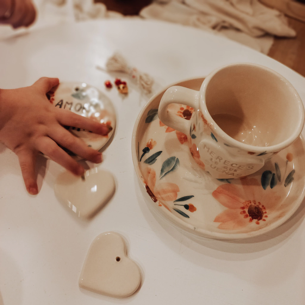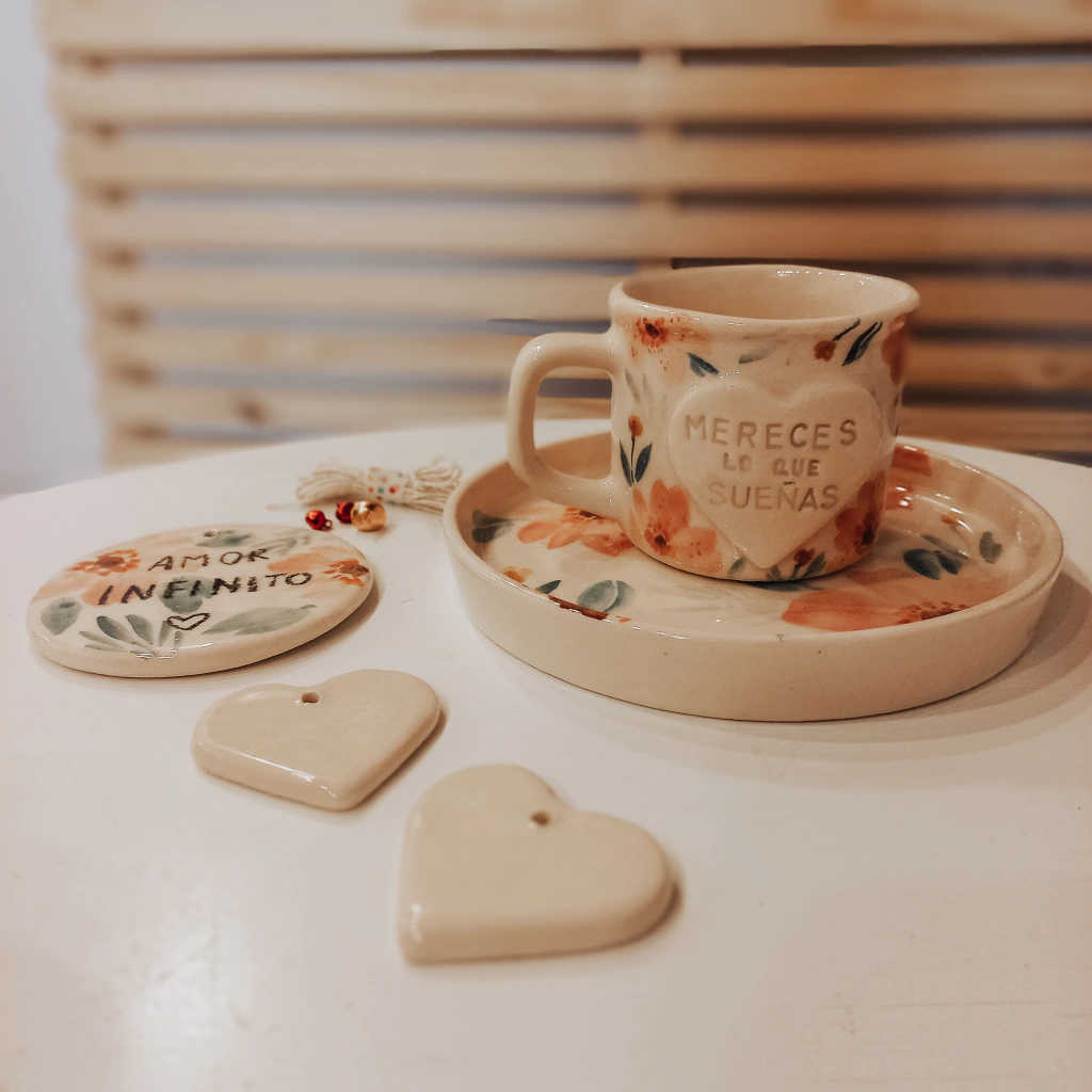 - Para armar movil: 3 corazones blancos y un medallon circular con fondo floreado y frase "amor infinito" + hilo de algodon + cascabeles