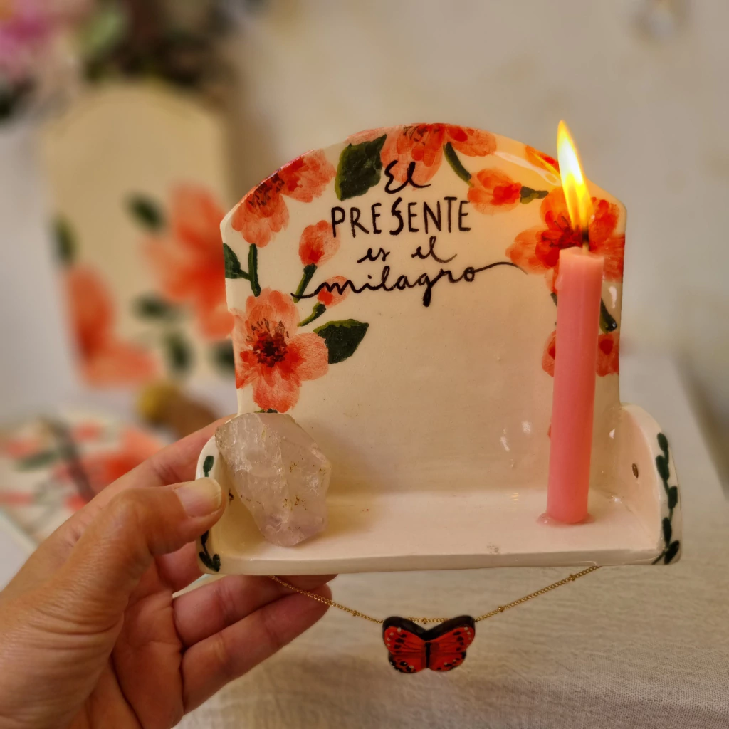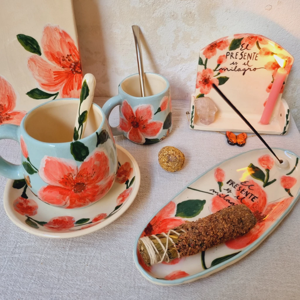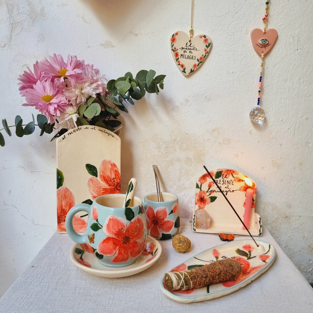 Este set esta pensado y diseñado para el dia de la madre, para todas las mamas que nos regalan su presente como milagro de la vida. Este super set contiene: Una taza de 350cc., con platito y cuchara, un matecito con bombilla incluida y un florero con un diseño original y hermoso. Incluye un portasahumerio en forma de platito ovalado, que sirve tambien para quemar sahumos, o bombitas, vienen de regalito un sahumito de sagrada madre, una bombita y un sahumerio. Este set hermoso tiene tambien un altarcito pequeño para colgar con velita rosa listo para intencionar y hacer tu lugar magico y especial. Por ultimo incluimos un atrapasol-amuleto para colgar frente al sol y dejar que el arcoiris inunde tu casa.