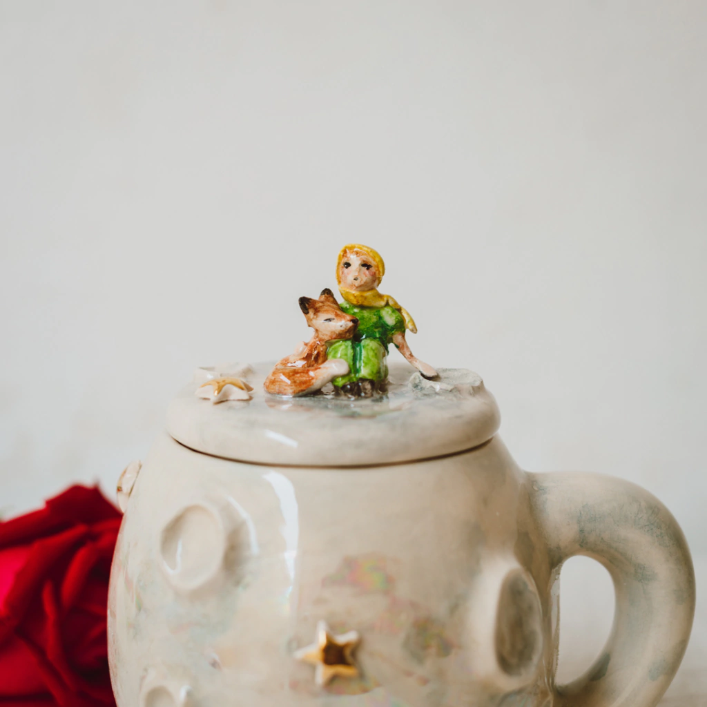 Taza de la colección "MI SECRETO", esta taza esta esmaltada en su totalidad y tiene un tapita para que tus infusiones esten siempre calientes. Es una pieza única inspirada en el maravilloso mundo de El principito. La taza simula ser el asteroide, tiene destellos tornasolados y apliques de estrellas en oro líquido. En su tapita una tierna figura del principito con el zorro termina de hacer mágica esta tacita.
