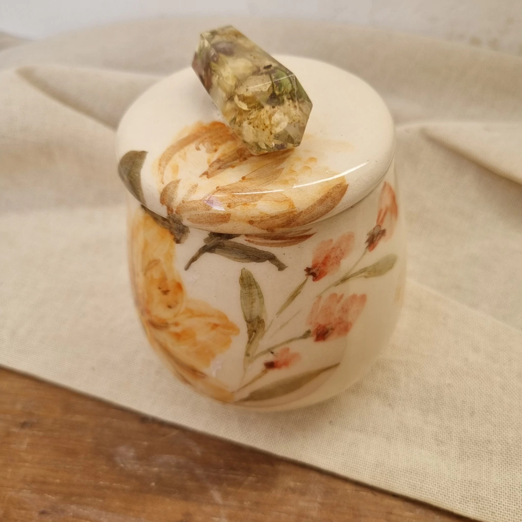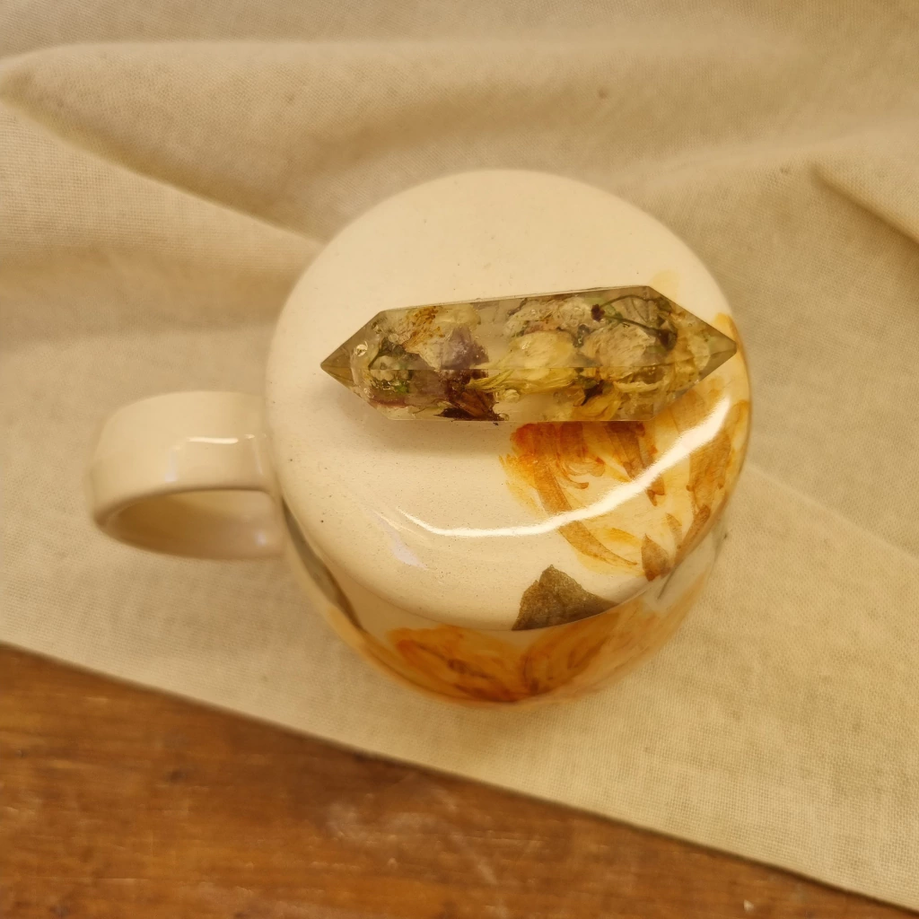 Taza de formato redondeado, el tamaño perfecto para cualquier infusion diaria. Esta taza en particular es de la coleccion Polvo de estrellas, tiene tapita y un "cristal" de resina epoxica encapsulando flores secas naturales, a modo de talisman. Es apta microondas pero no su tapa.