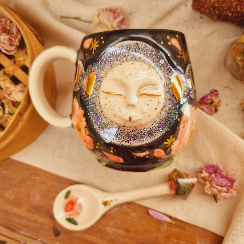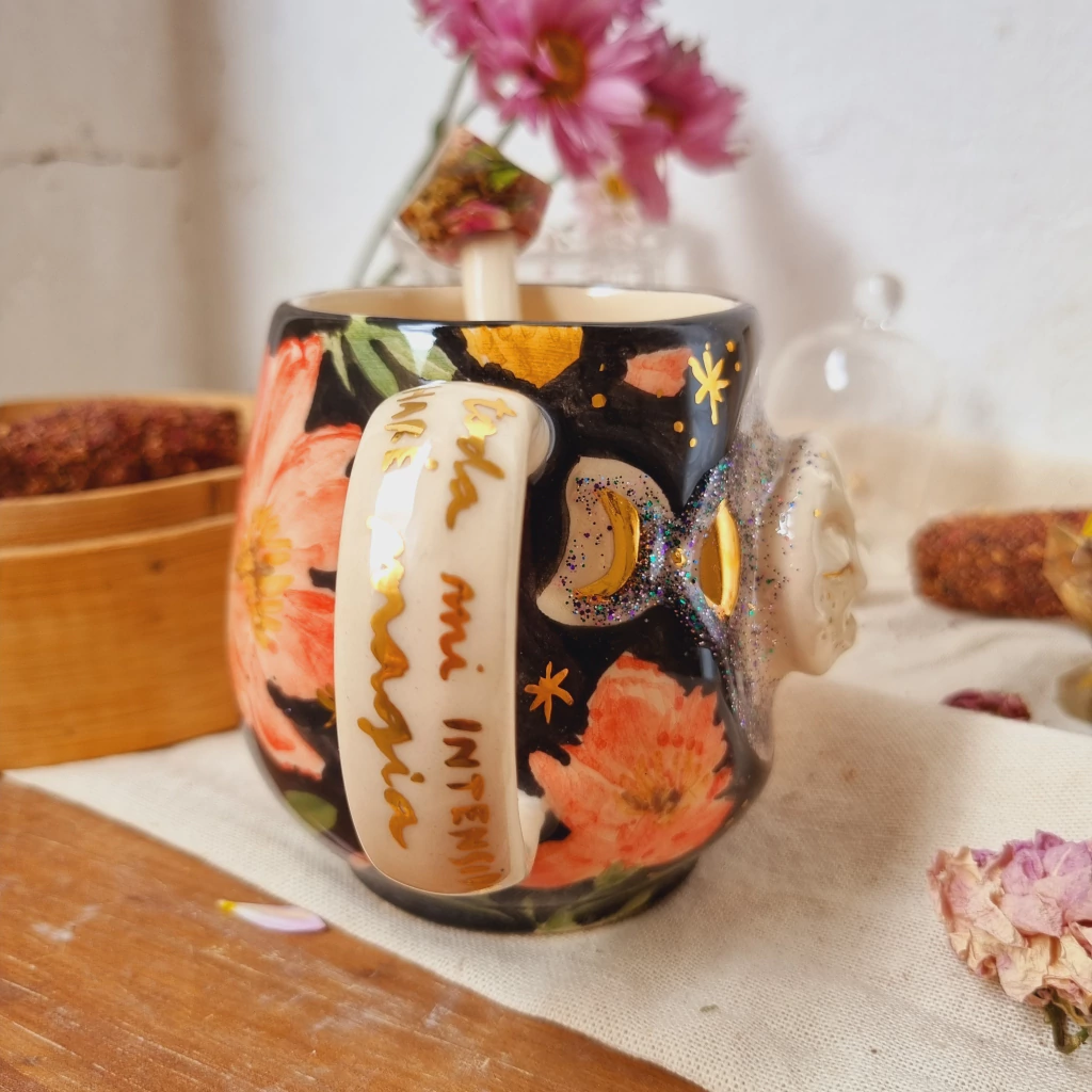 Esta taza en particular es una edicion limitada es la 3 de 10 piezas super unicas y especiales. Fueron realizadas como pequeñas obritas de arte para que te acompañen en tus ritualitos diarios. Tienen todo el trabajo en relieve, con glitter y detalles de oro liquido. Todas vienen con su cucharita mágica con un talisman en el extremo, lleno de flores naturales secas. NO SON aptas para microondas.