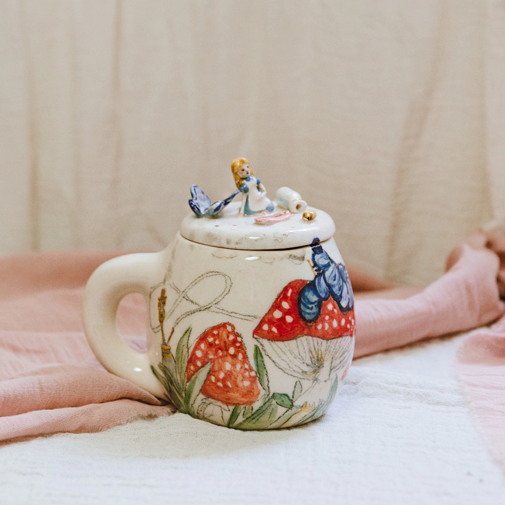 Taza de la cápsula Muchosidad, inspirada en el increible mundo de Alicia en el pais de las Maravillas. La taza esta ilustrada en su totalidad con hongos y donde aparece Absolem, la oruga azul; La tapita de la taza nos muestra a Alicia pequeñisima, del mismo tamaño que una mariposa azul, como en la que se convierte la oruga. Cada una de las piezas de esta coleccion tiene un alto nivel de detalle, y cada una es una pieza super única y cuando la tengas en tus manos la vas a amar aún mas.
